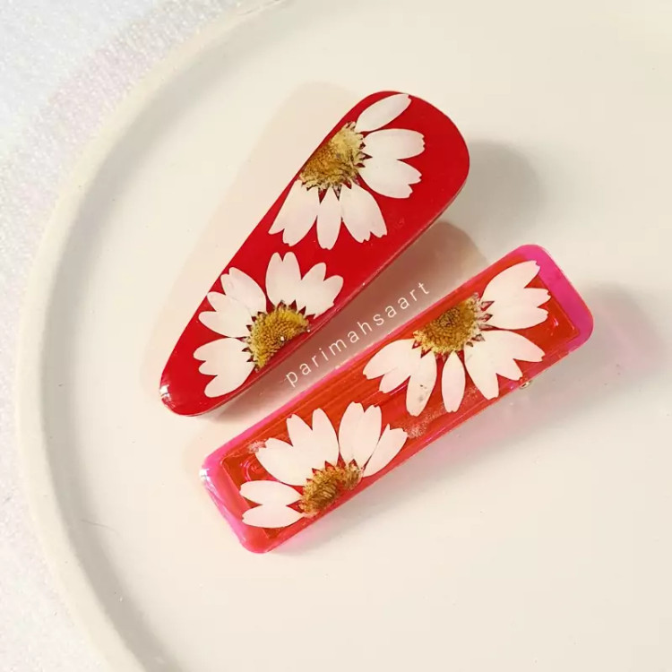 #گیره_سر بابونه 🌼😍🤩 تکی 🔸️با ضخامت کمتر از قبل بسیار محکم و بادوام مدل گیره ها انبری قابل ساخت در رنگهای مختلف بالایی قرمز مات پایینی سرخابی شفاف