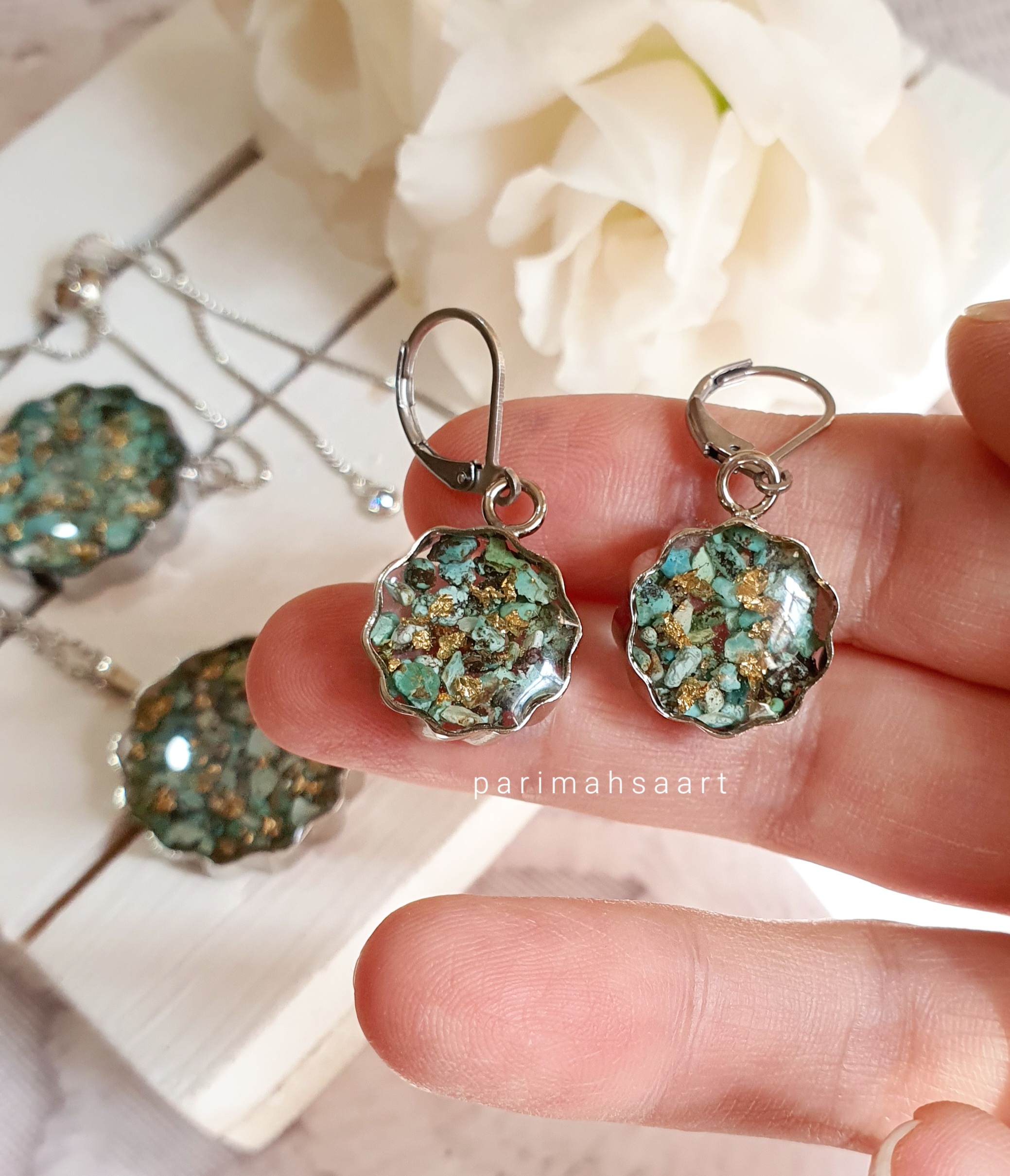 ست کامل فیروزه از فیروزه اصل نیشابور ساخته شده و شامل گردنبند با زنجیر ۴۵ سانت و دستبند آسانسوری و گوشواره با فریم خورشیدی میباشد